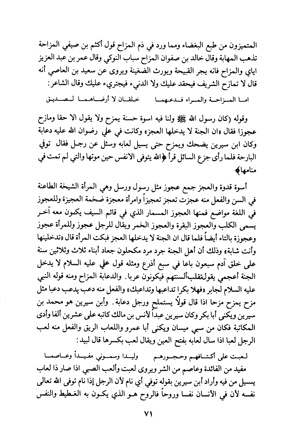 أسوة قدوة والعجز جمع عجوز مثل رسول ورسل وهي المرأة الشيخة الطاعنة في السن والفعل منه عجزت تعجز تعجيزا ًوامرأة معجزة ضخمة العجيزة وللعجوز في اللغة مواضع فمنها العجوز المسمار الذي في قائم السيف يكون معه آخر يسمى الكلب والعجوز البقرة والعجوز الخمر ويقال للرجل عجوز وللمرأة عجوز وعجوزة بالتاء أيضاً فلما قال أن الجنة لا يدخلها العجز فبكت المرأة قال " تدخلينها وأنت شابة " وذلك أن أهل الجنة جرد مرد مكحلون جعاد أبناء ثلاث وثلاثين سنة على خلق آدم سبعون باعا في سبع أذرع ومثله قول علي عليه السلام لا يدخل الجنة أعجمي يقول تقلب ألسنتهم فيكونون عربا. والدعابة المزاح ومنه قوله النبي عليه السلام لجابر " فهلا بكرا تداعبها وتداعبك " والفعل منه دعب يدعب دعبا مثل مزح يمزح مزحا إذا قال قولاً يستملحٍ ورجل دعابة. وأبن سيرين هو محمد بن سيرين ويكنى أبا بكر وكان سيرين عبداً لأنس بن مالك كاتبه على عشرين ألفا وأدى المكاتبة فكان من سبي ميسان ويكنى أبا عمرو واللعاب الريق والفعل منه لعب الرجل لعبا إذا سال لعابه بفتح العين ويقال لعب بكسرها قال لبيد: