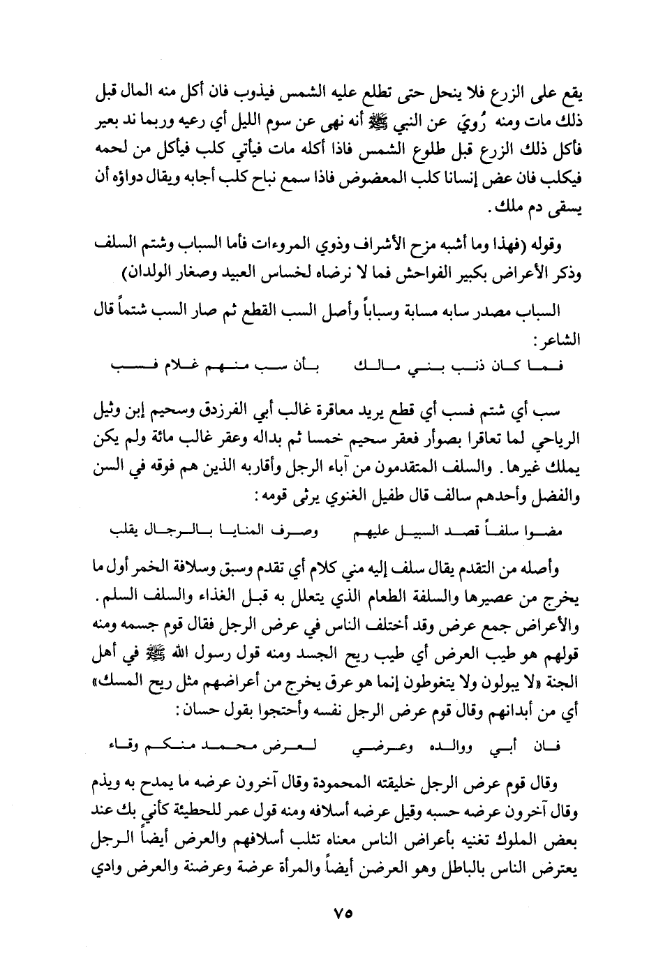 وأصله من التقدم يقال سلف إليه مني كلام أي تقدم وسبق وسلافة الخمر أول ما يخرج من عصيرها والسلفة الطعام الذي يتعلل به قبل الغذاء والسلف السلم. والأعراض جمع عرض وقد اختلف الناس في عرض الرجل فقال قوم جسمه ومنه قولهم هو طيب العرض أي طيب ريح الجسد ومنه قول رسول الله صلى الله عليه وسلم في أهل الجنة " لا يبولون ولا يتغوطون إنما هو عرق يخرج من أعراضهم مثل ريح المسك " أي من أبدانهم وقال قوم عرض الرجل نفسه واحتجوا بقول حسان: