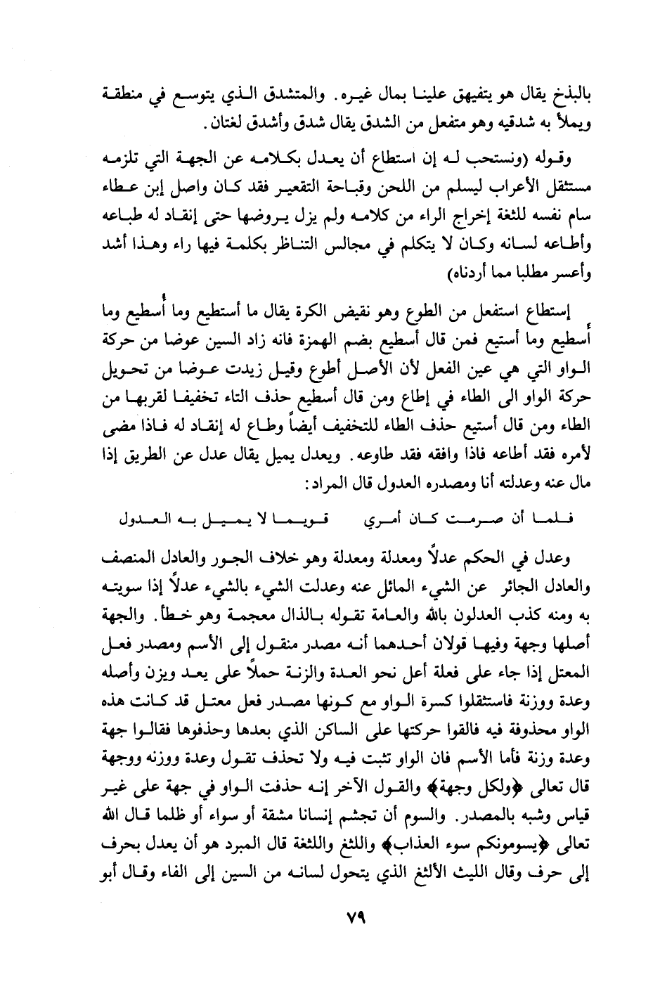 وعدل في الحكم عدلاً ومعدلة ومعدلة وهو خلاف الجور والعادل المنصف والعادل الجائر عن الشيء المائل عنه وعدلت الشيء بالشيء عدلاً إذا سويته به ومنه كذب العدلون بالله والعامة تقوله بالذال معجمة وهو خطأ. والجهة أصلها وجهة وفيها قولان أحدهما أنه مصدر منقول إلى الاسم ومصدر فعل المعتل إذا جاء على فعلة أعل نحو العدة والزنة حملاً على يعد ويزن وأصله وعدة ووزنة فاستثقلوا كسرة الواو مع كونها مصدر فعل معتل قد كانت هذه الواو محذوفة فيه فالقوا حركتها على الساكن الذي بعدها وحذفوها فقالوا جهة وعدة وزنة فأما الاسم فإن الواو تثبت فيه ولا تحذف تقول وعدة ووزنه ووجهة قال تعالى " ولكل جهة " والقول الآخر إنه حذفت الواو في جهة على غير قياس وشبه بالمصدر. والسوم أن تجشم إنسانا مشقة أو سواء أو ظلما قال الله تعالى " يسومونكم سوء العذاب " واللثغ واللثغة قال المبرد هو أن يعدل بحرف إلى حرف وقال الليث الألثغ الذي يتحول لسانه من السين إلى الفاء وقال أبو