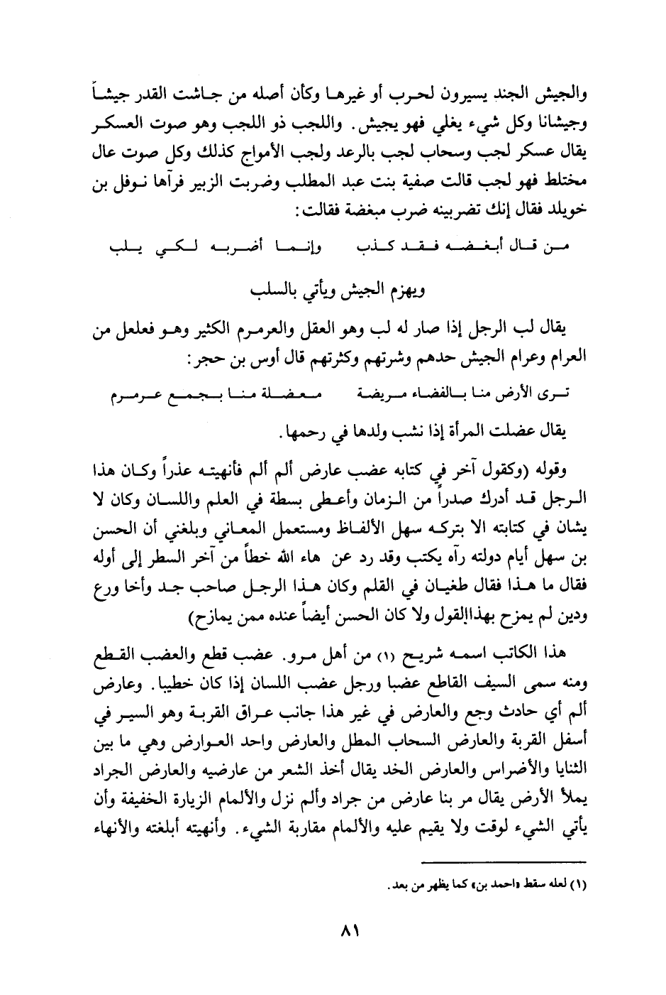 وقوله " وكقول آخر في كتابه عضب عارض ألم ألم فأنهيته عذراً وكان هذا الرجل قد أدرك صدراً من الزمان وأعطى بسطة في العلم واللسان وكان لا يشان في كتابته الا بتركه سهل الألفاظ ومستعمل المعاني وبلغني أن الحسن بن سهل أيام دولته رآه يكتب وقد رد عن هاء الله خطاً من آخر السطر إلى أوله فقال ماهذا فقال طغيان في القلم وكان هذا الرجل صاحب جد وأخا ورع ودين لم يمزح بهذا القول ولا كان الجيش أيضاً عنده ممن يمازح " هذا الكاتب اسمه شريح من أهل مرو عضب قطع والعضب القطع ومنه سمى السيف القاطع عضبا ورجل عضب اللسان إذا كان خطيبا. وعارض ألم أي حادث وجع والعارض في غير هذا جانب عراق القربة وهو السير في أسفل القربة والعارض السحاب المطل والعارض واحد العوارض وهي ما بين الثنايا والأضراس والعارض الخد يقال أخذ الشعر من عارضيه والعارض الجراد يملأ الأرض يقال مر بنا عارض من جراد وألم نزل والألمام الزيارة الخفيفة وأن يأتي الشيء لوقت ولا يقيم عليه والألمام مقاربة الشيء. وأنهيته أبلغته والأنهاء
