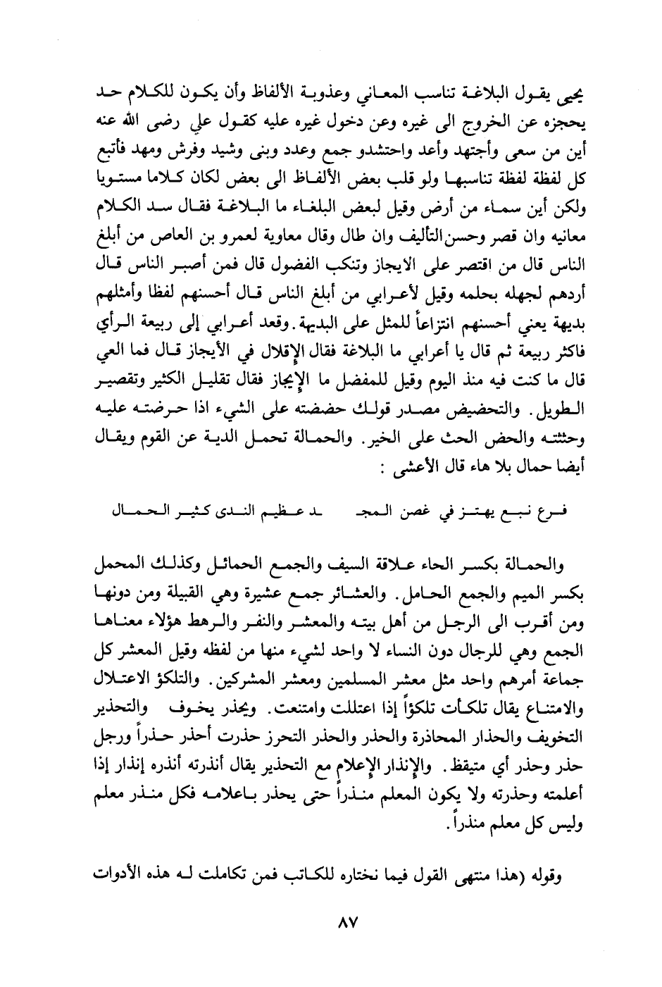 ومهد فاتبع كل لفظة لفظة تناسبها ولو قلب بعض الألفاظ إلى بعض لكان كلاما مستويا ولكن أين سماء من أرض وقيل لبعض البلغاء ما البلاغة فقال سد الكلام معانيه وإن قصر وحسن التأليف وإن طال وقال معاوية لعمرو بن العاص من أبلغ الناس قال من اقتصر على الإيجاز وتنكب الفضول قال فمن أصبر الناس قال أردهم لجهله بحلمه وقيل لأعرابي من أبلغ الناس قال أحسنهم لفظا وأمثلهم بديهة يعني أحسنهم انتزاعاً للمثل على البديهة وقعد أعرابي إلى ربيعة الرأي فأكثر ربيعة ثم قال يا أعرابي ما البلاغة فقال الإقلال في الإيجاز قال فما العي قال ما كنت فيه منذ اليوم وقيل للمفضل ما الإيجاز فقال تقليل الكثير وتقصير الطويل. والتحضيض مصدر قولك حضضته على الشيء إذا حرضته عليه وحثثته والحض الحث على الخير. والحمالة تحمل الدية عن القوم ويقال أيضا حمال بلا هاء قال الأعشى: