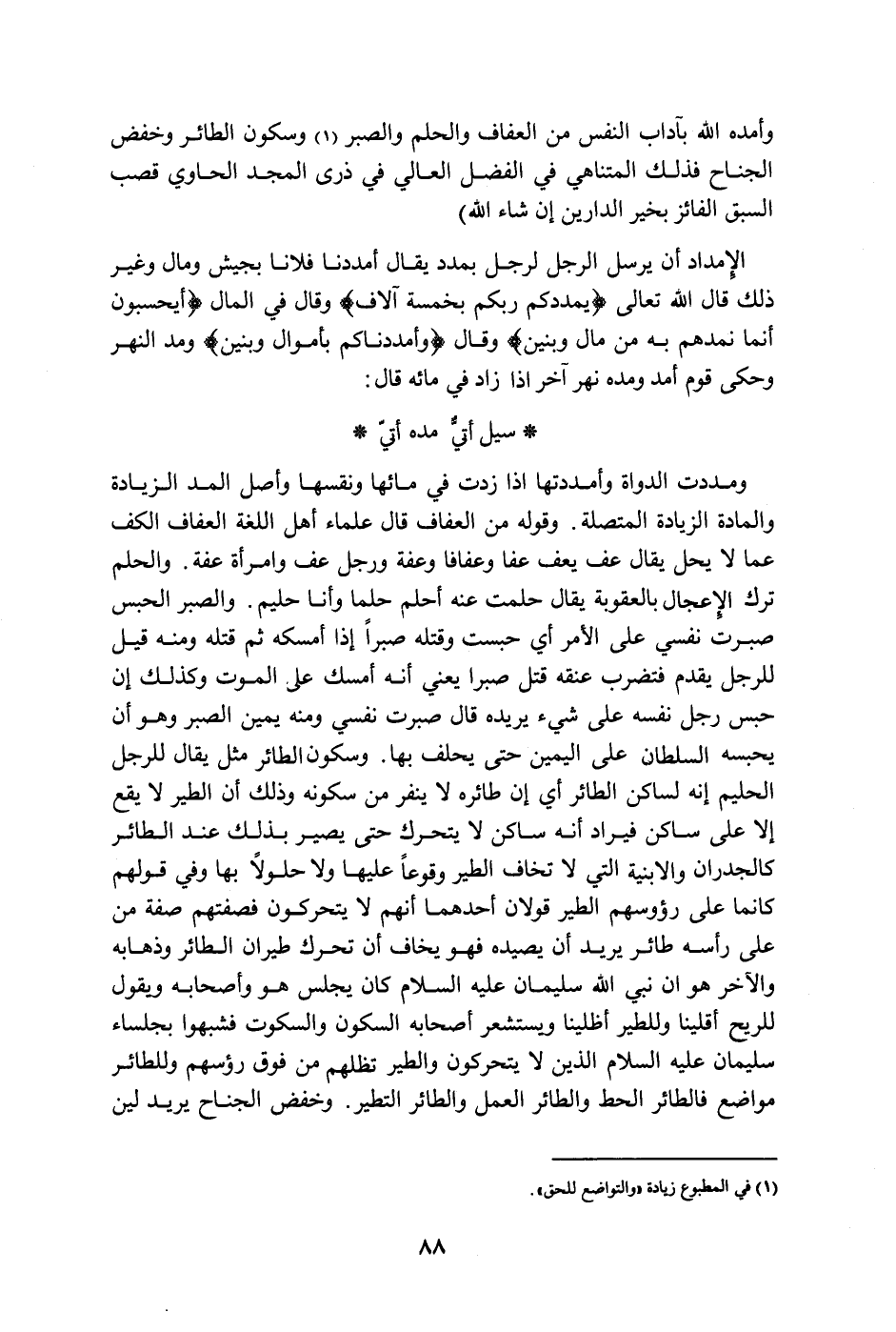 ومددت الدواة وأمددتها إذا زدت في مائها ونقسها وأصل المد الزيادة والمادة الزيادة المتصلة. وقوله من العفاف قال علماء أهل اللغة العفاف الكف عما لا يحل يقال عف يعف عفا عفافا وعفة ورجل عف وامرأة عفة. والحلم ترك الإعجال بالعقوبة يقال حلمت عنه أحلم حلما وأنا حليم. والصبر الحبس صبرت نفسي على الأمر أي حبست وقتله صبراً إذا أمسكه ثم قتله ومنه قيل للرجل يقدم فتضرب عنقه قتل صبرا يعني أنه أمسك على الموت وكذلك إن حبس رجل نفسه على شيء يريده قال صبرت نفسي ومنه يمين الصبر وهو أن يحبسه السلطان على اليمين حتى يحلف بها. وسكون الطائر مثل يقال للرجل الحليم إنه لساكن الطائر أي إن طائره لا ينفر من سكونه وذلك أن الطير لا يقع إلا على ساكن فيراد أنه ساكن لا يتحرك حتى يصير بذلك عند الطائر كالجدران والأبنية التي لا تخاف الطير وقوعاً عليها ولا حلولاً بها وفي قولهم كأنما على رؤوسهم الطير قولان أحدهما أنهم لا يتحركون فصفتهم صفة من على رأسه طائر يريد أن يصيده فهو يخاف أن تحرك طيران الطائر وذهابه والآخر هو أن نبي الله سليمان عليه السلام كان يجلس هو وأصحابه ويقول للريح أقلينا وللطير أظلينا ويستشعر أصحابه السكون والسكوت فشبهوا بجلساء سليمان عليه السلام الذين لا يتحركون والطير تظلهم من فوق رؤوسهم وللطائر مواضع فالطائر الحط والطائر العمل والطائر التطير. وخفض الجناح يريد لين