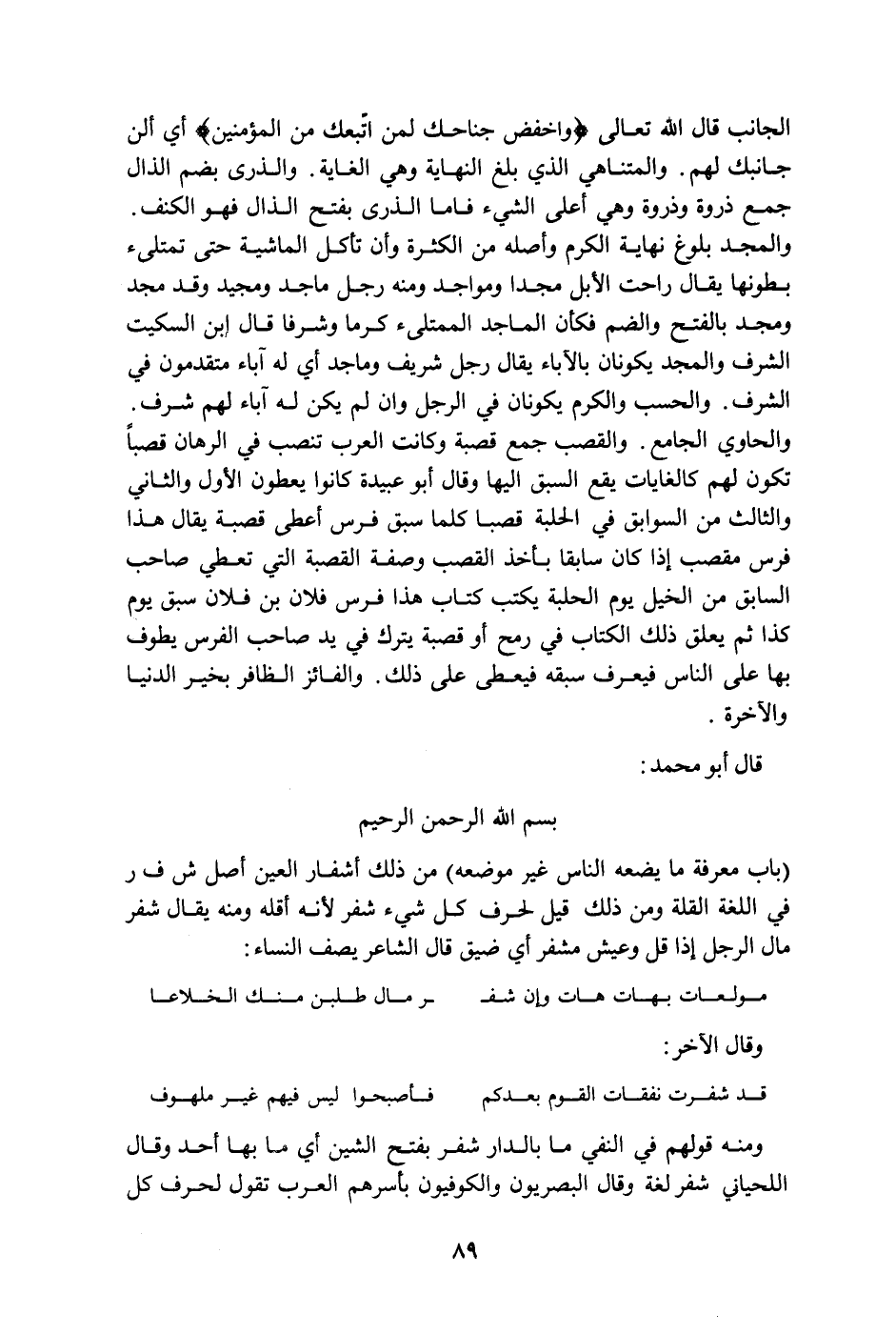 قال أبو محمد: بسم الله الرحمن الرحيم " باب معرفة ما يضعه الناس غير موضعه " من ذلك أشفار العين أصل ش ف ر في اللغة القلة ومن ذلك قيل لحرف كل شيء شفر لأنه أقله ومنه يقال شفر مال الرجل إذا قل وعيش مشفر أي ضيق قال الشاعر يصف النساء: