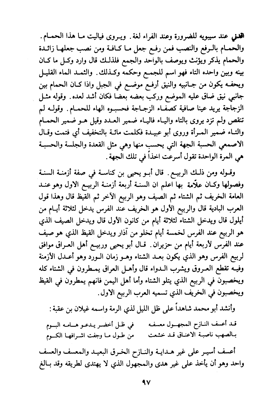 وقوله ومن ذلك الربيع. قال أبو يحيى بن كناسة في صفة أزمنة السنة وفصولها وكان علاّمة بها أعلم أن السنة أربعة أزمنة الربيع الأول وهو عند العامة الخريف ثم الشتاء ثم الصيف وهو الربيع الآخر ثم القيظ قال وهذا قول العرب البادية قال والربيع الأول هو الخريف عند الفرس يدخل لثلاثة أيام من أيلول قال ويدخل الشتاء لثلاثة أيام من كانون الأول قال ويدخل الصيف الذي هو الربيع عند الفرس لخمسة أيام تخلو من آذار ويدخل القيظ الذي هو صيف عند الفرس لأربعة أيام حزيران. قال أبو يحيى وربيع أهل العراق موافق لربيع الفرس وهو الذي يكون بعد الشتاء وهو زمان الورد وهو أعدل الأزمنة وفيه تقطع العروق ويشرب الدواء قال وأهل العراق يمطرون في الشتاء كله ويخصبون في الربيع الذي يتلو الشتاء وأما أهل اليمن فإنهم يمطرون في القيظ ويخصبون في الخريف الذي تسميه العرب الربيع الأول.