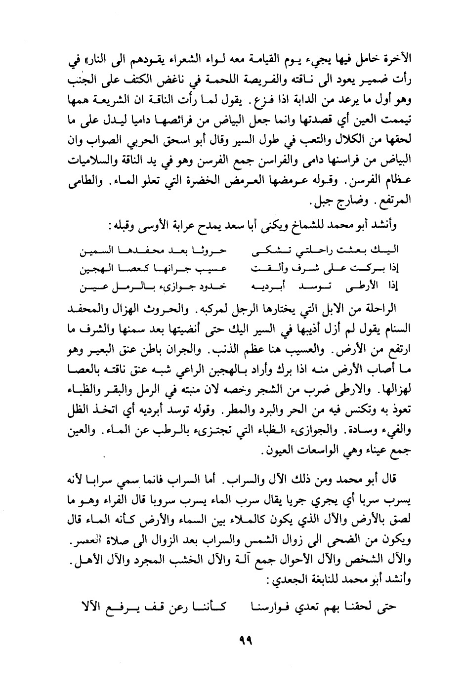 قال أبو محمد ومن ذلك الآل والسراب. أما السراب فإنما سمي سرابا لأنه يسرب سربا أي يجري جريا يقال سرب الماء يسرب سروبا قال الفراء وهو ما لصق بالأرض والآل الذي يكون كالملاء بين السماء والأرض كأنه الماء قال ويكون من الضحى إلى زوال الشمس والسراب بعد الزوال إلى صلاة العصر. والآل الشخص والآل الأحوال جمع آلة والآل الخشب المجرد والآل الأهل. وأنشد أبو محمد للنابغة الجعدي: