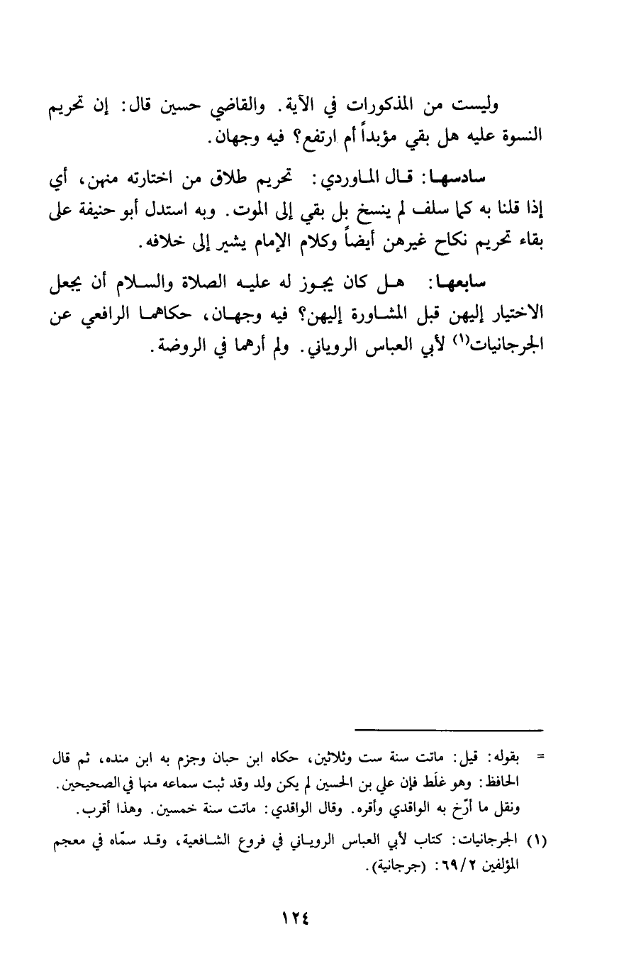 وَالْقَاضِي حُسَيْن قَالَ إِن تَحْرِيم النسْوَة عَلَيْهِ هَل بَقِي مُؤَبَّدًا أم ارْتَفع فِيهِ وَجْهَان