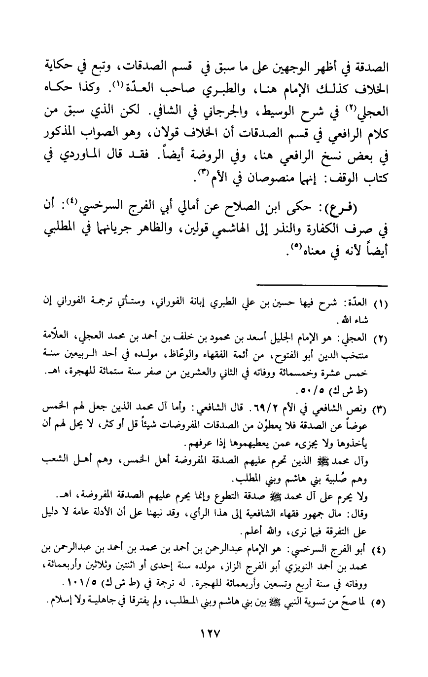 (فرع) حكى ابْن الصّلاح عَن أمالي أبي الْفرج السَّرخسِيّ أَن فِي صرف الْكَفَّارَة وَالنّذر إِلَى الْهَاشِمِي قَوْلَيْنِ وَالظَّاهِر جريانهما فِي المطلبي أَيْضا لِأَنَّهُ فِي مَعْنَاهُ