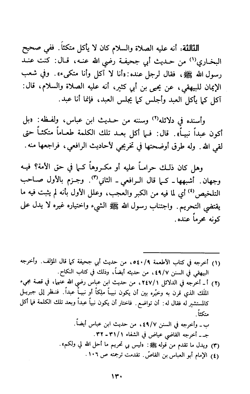 فَفِي صَحِيح البُخَارِيّ من حَدِيث أبي جُحَيْفَة رَضِي الله عَنهُ قَالَ كنت عِنْد رَسُول الله صلى الله عَلَيْهِ وَسلم فَقَالَ لرجل عِنْده (أَنا لَا آكل وَأَنا متكئ)
