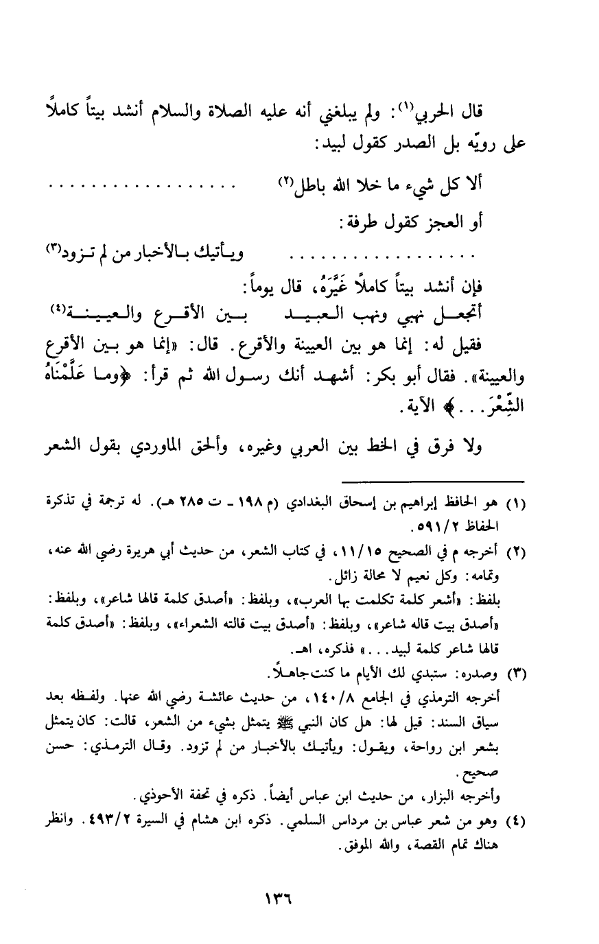 قَالَ الْحَرْبِيّ وَلم يبلغنِي أَنه عَلَيْهِ الصَّلَاة وَالسَّلَام أنْشد بَيْتا كَامِلا على رويه بل الصَّدْر كَقَوْل لبيد