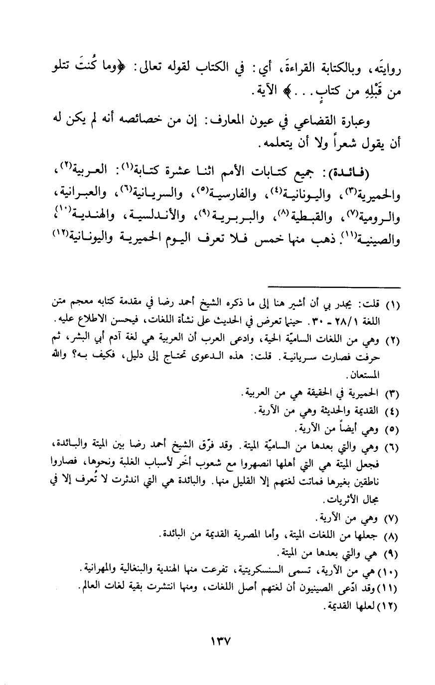 (فَائِدَة) جَمِيع كتابات الْأُمَم اثْنَا عشرَة كِتَابَة الْعَرَبيَّة والحميرية واليونانية والفارسية والسريانية والعبرانية والرومية والقبطية والبربرية والأندلسية والهندية والصينية