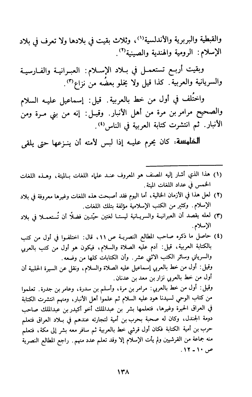والقبطية والبربرية والأندلسية وَثَلَاث بقيت فِي بلادها وَلَا تعرف فِي بِلَاد الْإِسْلَام الرومية والهندية والصينية