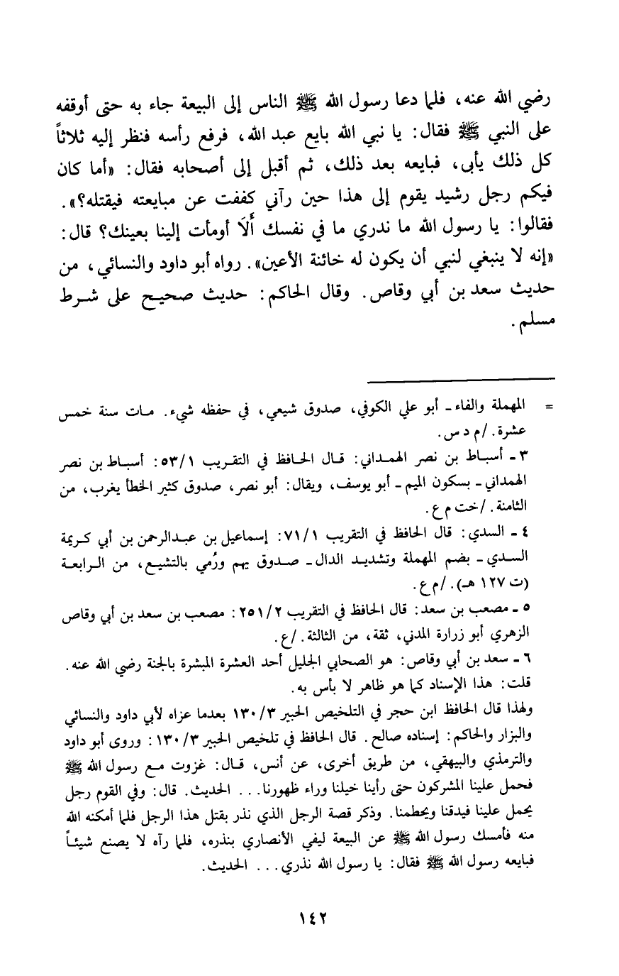 رَضِي الله عَنهُ فَلَمَّا دَعَا رَسُول الله صلى الله عَلَيْهِ وَسلم النَّاس إِلَى الْبيعَة جَاءَ بِهِ حَتَّى أوقفهُ على النَّبِي صلى الله عَلَيْهِ وَسلم فَقَالَ يَا نَبِي الله بَايع عبد الله فَرفع رَأسه فَنظر إِلَيْهِ ثَلَاثًا كل ذَلِك يَأْبَى فَبَايعهُ بعد ذَلِك ثمَّ أقبل إِلَى أَصْحَابه فَقَالَ (أما كَانَ فِيكُم رجل رشيد يقوم إِلَى هَذَا حِين رَآنِي كَفَفْت عَن مبايعته فيقتله)