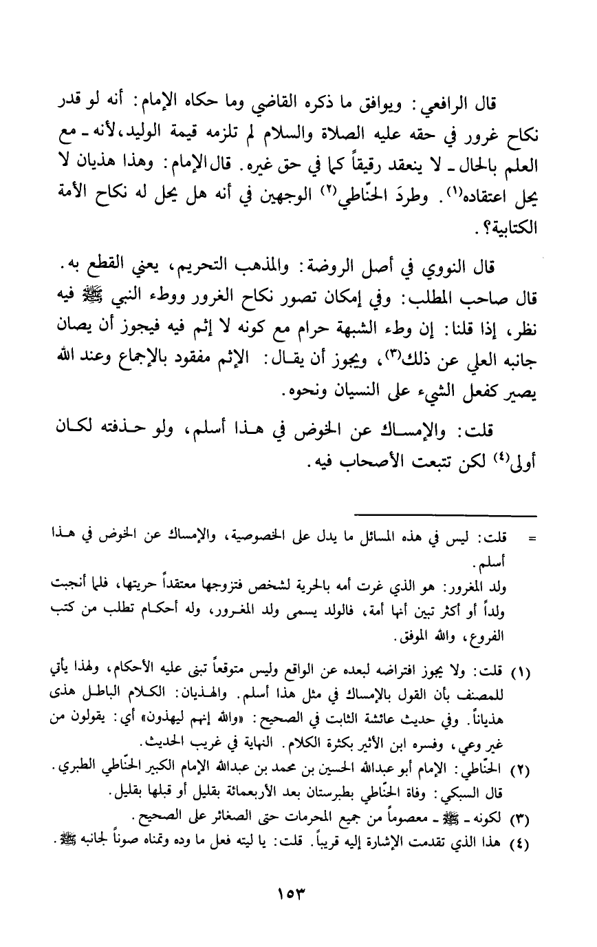 قَالَ صَاحب الْمطلب وَفِي إِمْكَان تصور نِكَاح الْغرُور وَوَطْء النَّبِي صلى الله عَلَيْهِ وَسلم فِيهِ نظر إِذا قُلْنَا إِن وَطْء الشُّبْهَة حرَام مَعَ كَونه لَا إِثْم فِيهِ فَيجوز أَن يصان جَانِبه الْعلي عَن ذَلِك وَيجوز أَن يُقَال الْإِثْم مَفْقُود بِالْإِجْمَاع وَعند الله يصير كَفعل الشَّيْء على النسْيَان وَنَحْوه