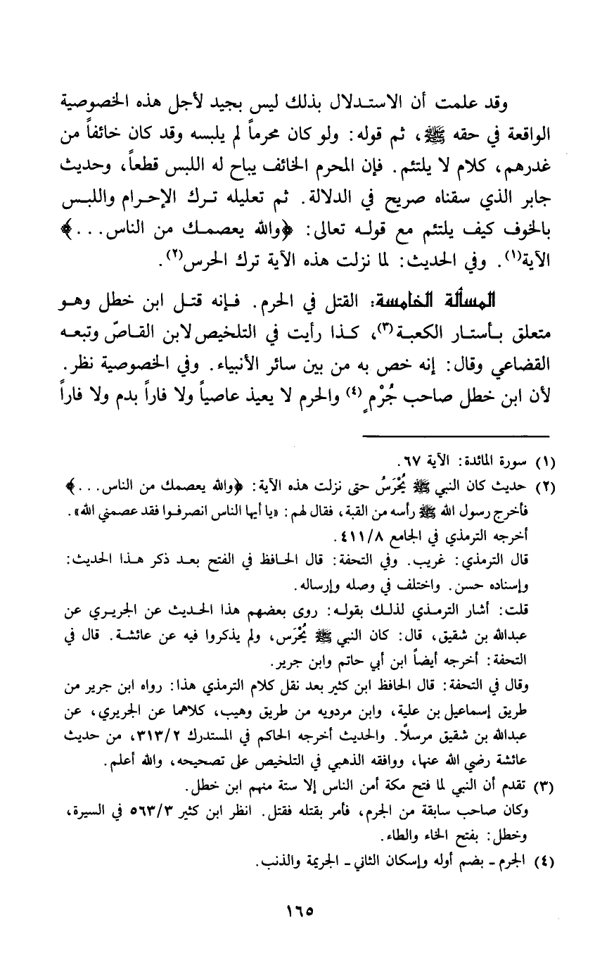وَقد علمت أَن الِاسْتِدْلَال بذلك لَيْسَ بجيد لأجل هَذِه الخصوصية الْوَاقِعَة فِي حَقه صلى الله عَلَيْهِ وَسلم ثمَّ قَوْله وَلَو كَانَ محرما لم يلْبسهُ وَقد كَانَ خَائفًا من غدرهم كَلَام لَا يلتئم