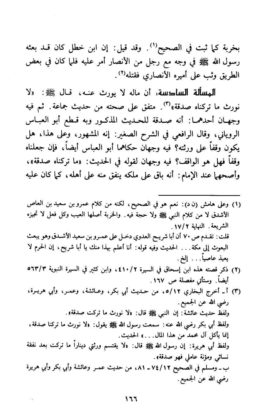 الْمَسْأَلَة السَّادِسَة أَن مَاله لَا يُورث عَنهُ قَالَ صلى الله عَلَيْهِ وَسلم (لَا نورث مَا تَرَكْنَاهُ صَدَقَة)