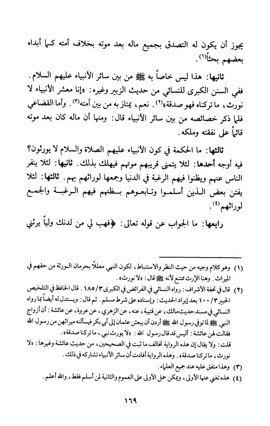 فَفِي السّنَن الْكُبْرَى للنسائي من حَدِيث الزبير وَغَيره (إِنَّا معشر الْأَنْبِيَاء لَا نورث مَا تَرَكْنَاهُ فَهُوَ صَدَقَة)