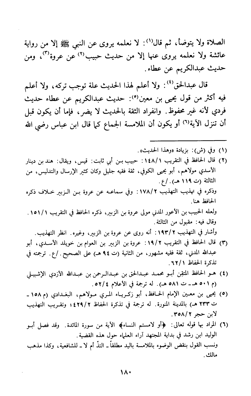 الصَّلَاة وَلَا يتَوَضَّأ ثمَّ قَالَ لَا نعلمهُ يرْوى عَن النَّبِي صلى الله عَلَيْهِ وَسلم إِلَّا من رِوَايَة عَائِشَة وَلَا نعلمهُ يرْوى عَنْهَا إِلَّا من حَدِيث حبيب عَن عُرْوَة وَمن حَدِيث عبد الْكَرِيم عَن عَطاء