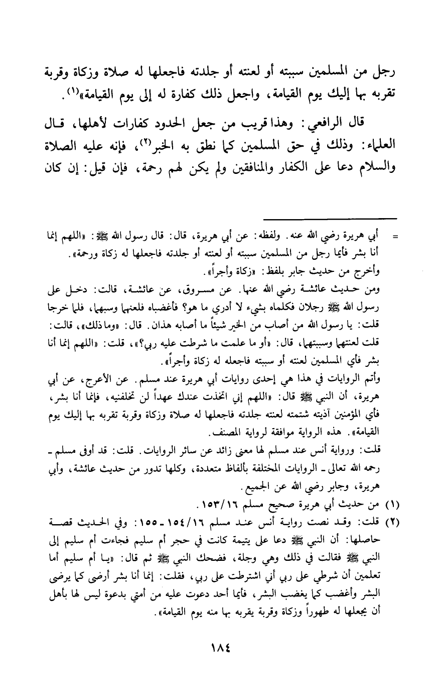 رجل من الْمُسلمين سببته أَو لعنته أَو جلدته فاجعلها لَهُ صَلَاة وَزَكَاة وقربة تقربه بهَا إِلَيْك يَوْم الْقِيَامَة وَاجعَل ذَلِك كَفَّارَة لَهُ إِلَى يَوْم الْقِيَامَة)
