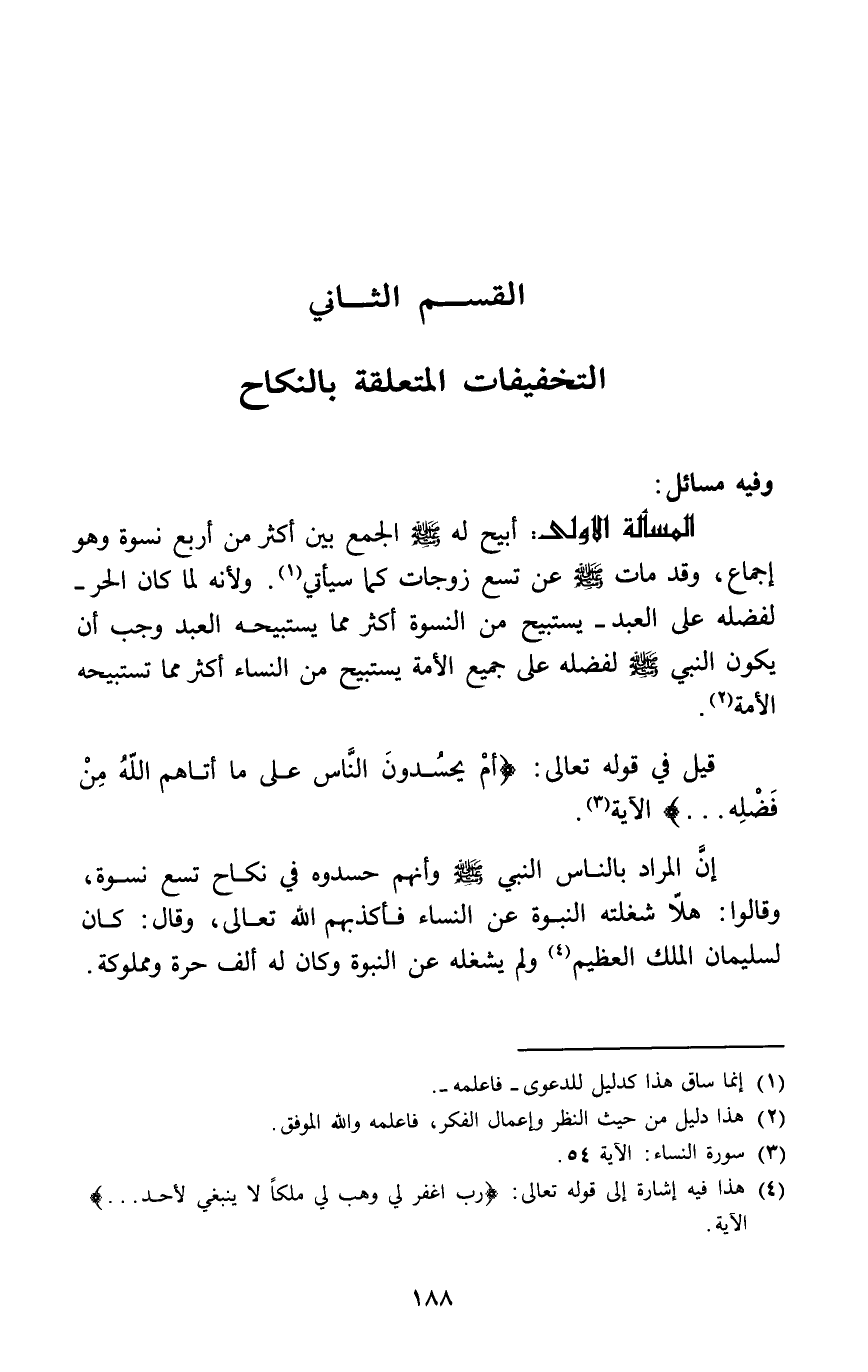 الْمَسْأَلَة الأولى أُبِيح لَهُ صلى الله عَلَيْهِ وَسلم الْجمع بَين أَكثر من أَربع نسْوَة وَهُوَ إِجْمَاع وَقد مَاتَ صلى الله عَلَيْهِ وَسلم عَن تسع زَوْجَات كَمَا سَيَأْتِي