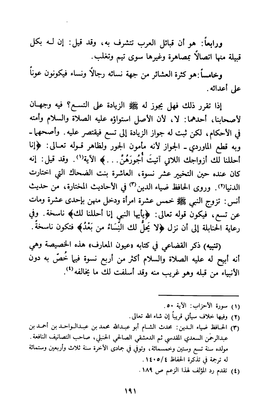 (تَنْبِيه) ذكر الْقُضَاعِي فِي كِتَابه (عُيُون المعارف) هَذِه الخصيصة وَهِي أَنه أُبِيح لَهُ عَلَيْهِ الصَّلَاة وَالسَّلَام أَكثر من أَربع نسْوَة فِيمَا خص بِهِ دون الْأَنْبِيَاء من قبله وَهُوَ غَرِيب مِنْهُ وَقد أسلفت لَك مَا يُخَالِفهُ