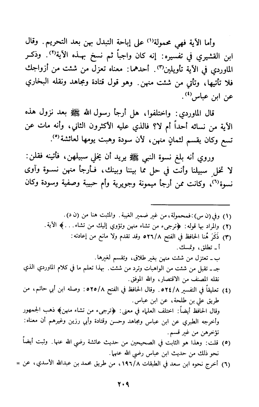 قَالَ الْمَاوَرْدِيّ وَاخْتلفُوا هَل أرجأ رَسُول الله صلى الله عَلَيْهِ وَسلم بعد نزُول هَذِه الْآيَة من نِسَائِهِ أحدا أم لَا فَالَّذِي عَلَيْهِ الْأَكْثَرُونَ الثَّانِي وانه مَاتَ عَن تسع وَكَانَ يقسم لثمان مِنْهُنَّ لِأَن سَوْدَة وهبت يَوْمهَا لعَائِشَة