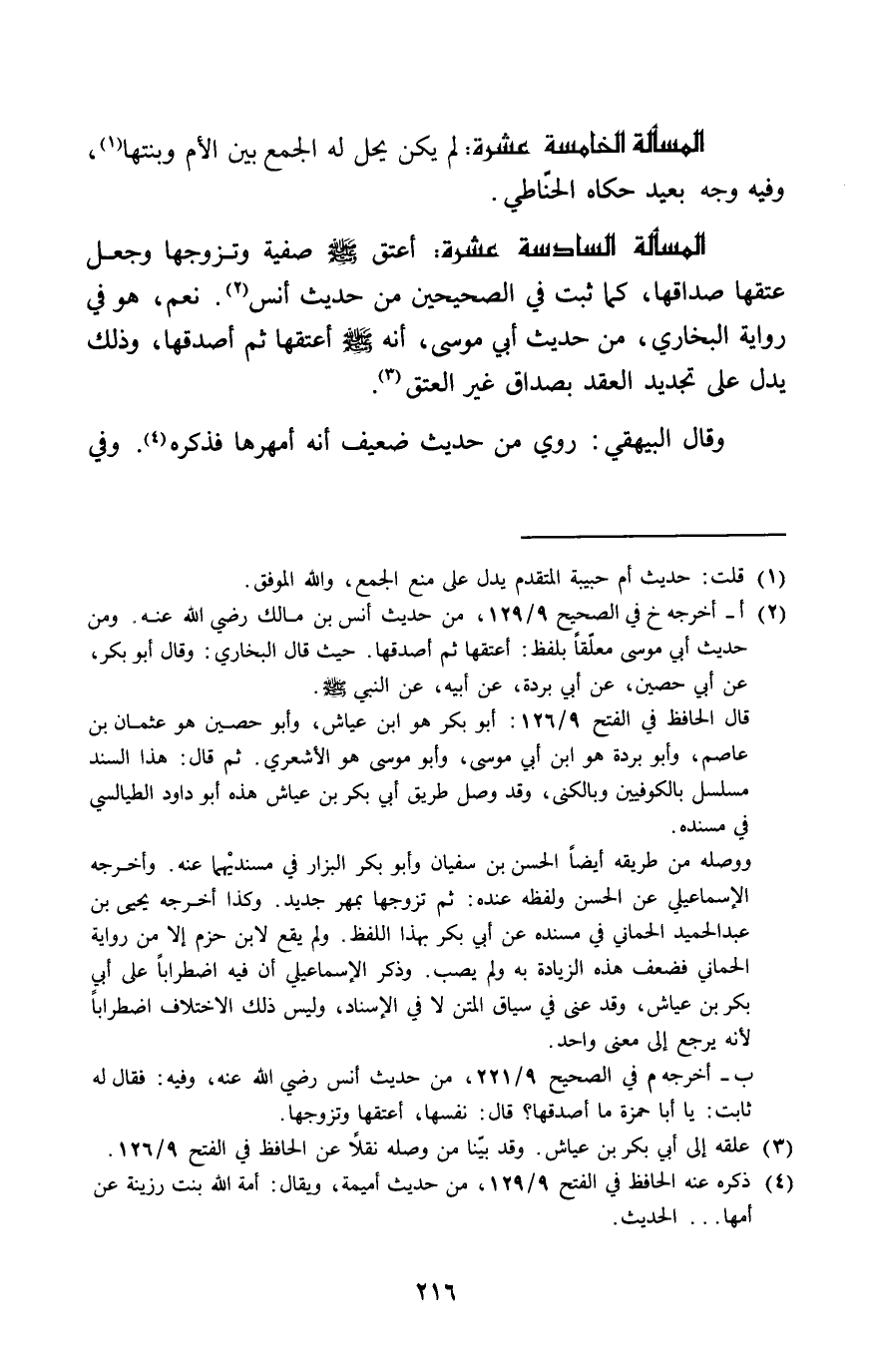 الْمَسْأَلَة السَّادِسَة عشرَة أعتق صلى الله عَلَيْهِ وَسلم صَفِيَّة وَتَزَوجهَا وَجعل عتقهَا صَدَاقهَا كَمَا ثَبت فِي الصَّحِيحَيْنِ من حَدِيث أنس نعم هُوَ فِي رِوَايَة البُخَارِيّ من حَدِيث أبي مُوسَى أَنه صلى الله عَلَيْهِ وَسلم أعْتقهَا ثمَّ أصدقهَا وَذَلِكَ يدل على تَجْدِيد العقد بِصَدَاق غير الْعتْق