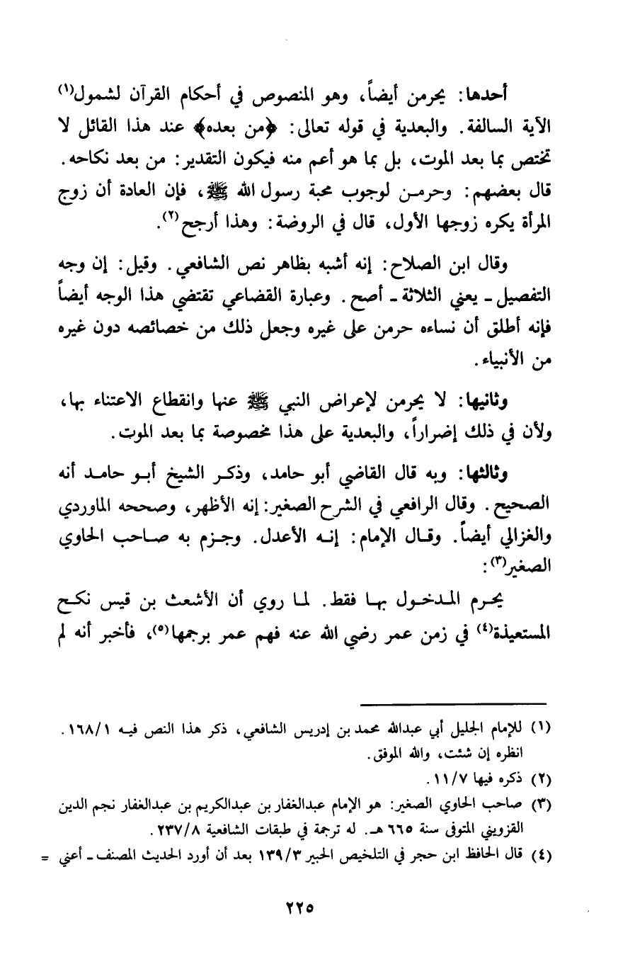 وَثَانِيها لَا يحرمن لإعراض النَّبِي صلى الله عَلَيْهِ وَسلم عَنْهَا وَانْقِطَاع الاعتناء بهَا وَلِأَن فِي ذَلِك إِضْرَارًا والبعدية على هَذَا مَخْصُوصَة بِمَا بعد الْمَوْت