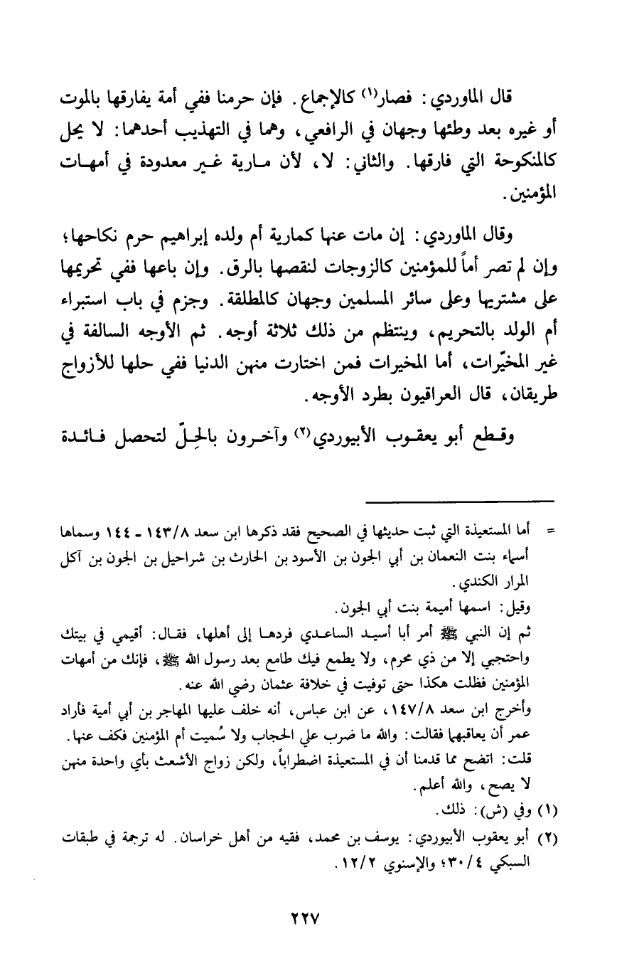 وَقَالَ الْمَاوَرْدِيّ إِن مَاتَ عَنْهَا كمارية أم وَلَده إِبْرَاهِيم حرم نِكَاحهَا وَإِن لم تصر أما للْمُؤْمِنين كالزوجات لنقصها بِالرّقِّ
