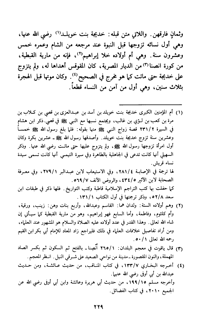 وَهِي أم أَوْلَاده خلا إِبْرَاهِيم فَإِنَّهُ من مَارِيَة الْقبْطِيَّة من كورة انصنا من الديار المصرية كَانَ الْمُقَوْقس أهداها لَهُ وَلم يتَزَوَّج على خَدِيجَة حَتَّى مَاتَت كَمَا هُوَ مخرج فِي الصَّحِيح