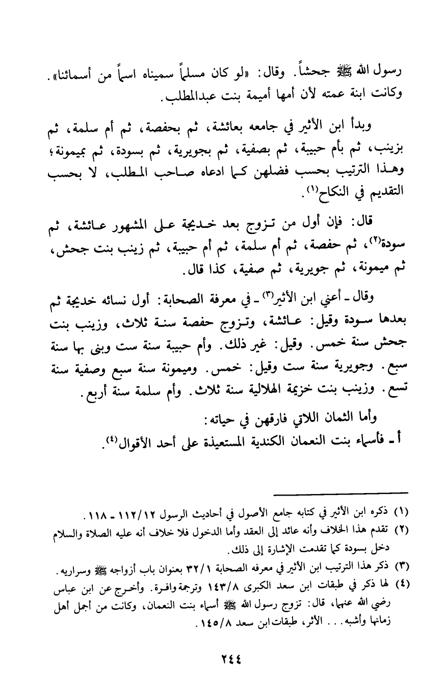 وَبَدَأَ ابْن الْأَثِير فِي جَامعه بعائشة ثمَّ بحفصة ثمَّ أم سَلمَة ثمَّ بِزَيْنَب ثمَّ بِأم حَبِيبَة ثمَّ بصفية ثمَّ بجويرية ثمَّ بسودة ثمَّ بميمونة وَهَذَا التَّرْتِيب بِحَسب فضلهن كَمَا ادَّعَاهُ صَاحب الْمطلب لَا بِحَسب التَّقْدِيم فِي النِّكَاح