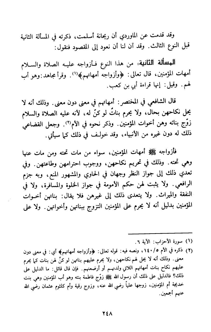 المسالة الثَّانِيَة من هَذَا النَّوْع فأزواجه عَلَيْهِ الصَّلَاة وَالسَّلَام أُمَّهَات الْمُؤمنِينَ قَالَ تَعَالَى {وأزواجه أمهاتهم}