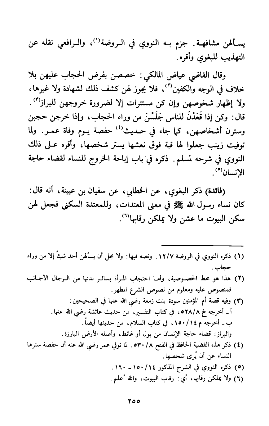 قَالَ وَكن إِذا قعدن للنَّاس جلسن من وَرَاء الْحجاب وَإِذا خرجن حجبن وسترن أشخاصهن كَمَا جَاءَ فِي حَدِيث حَفْصَة يَوْم وَفَاة عمر