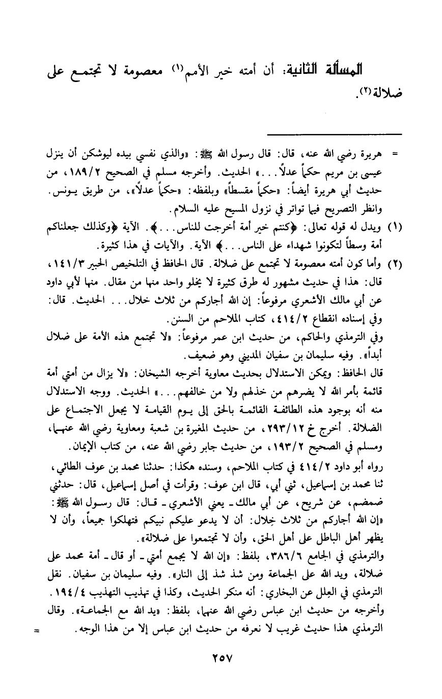 الْمَسْأَلَة الثَّانِيَة أَن أمته خير الْأُمَم معصومة لَا تَجْتَمِع على ضلال ابدا