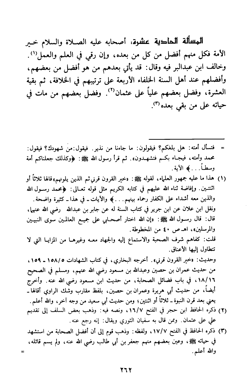 الْمَسْأَلَة الْحَادِيَة عشرَة أَصْحَابه عَلَيْهِ الصَّلَاة وَالسَّلَام خير الْأمة فَكل مِنْهُم أفضل من كل من بعده وَإِن رقي فِي الْعلم وَالْعَمَل