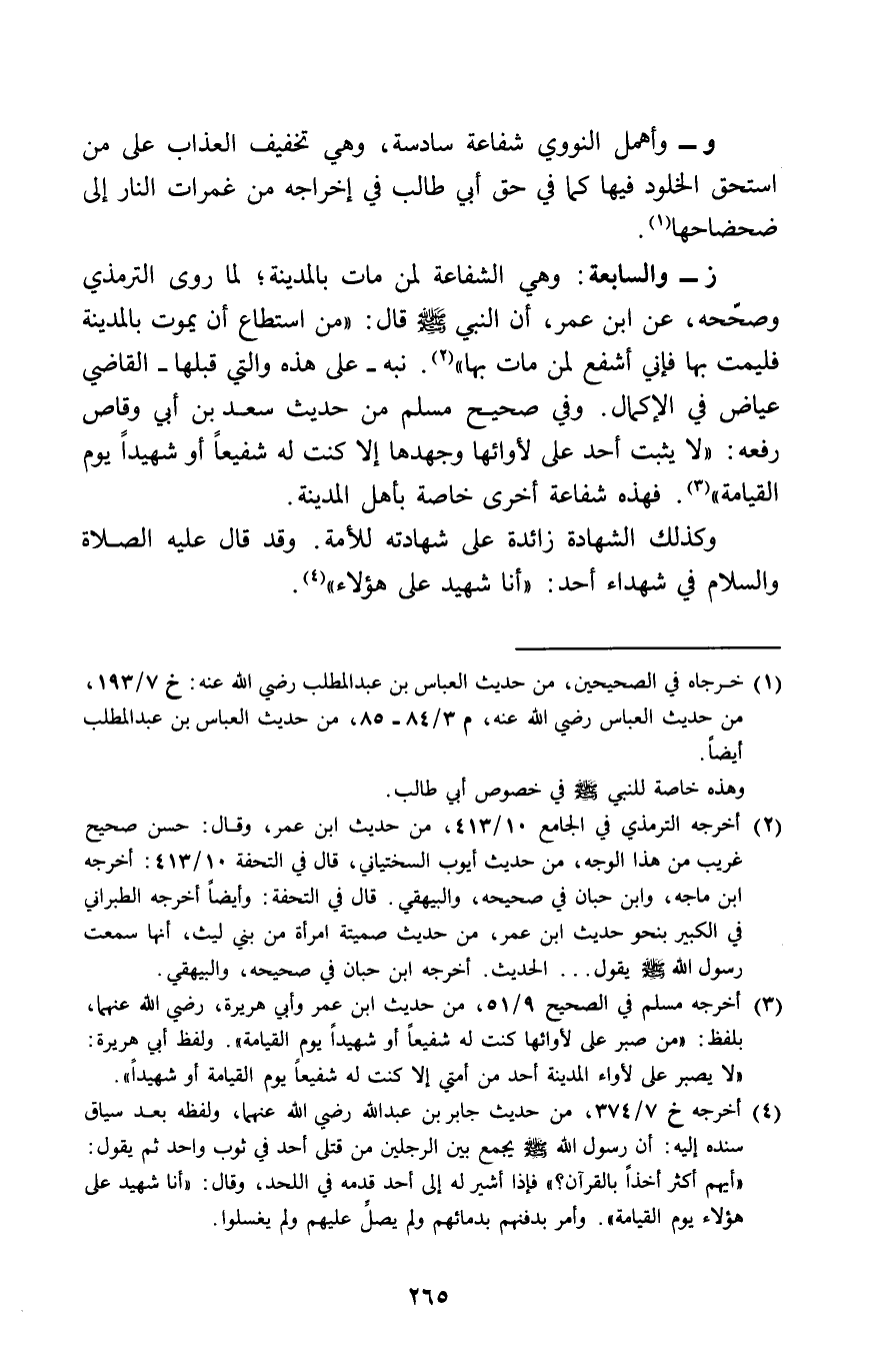 ز - وَالسَّابِعَة وَهِي الشَّفَاعَة لمن مَاتَ بِالْمَدِينَةِ لما روى التِّرْمِذِيّ وَصَححهُ عَن ابْن عمر أَن النَّبِي صلى الله عَلَيْهِ وَسلم قَالَ (من اسْتَطَاعَ أَن يَمُوت بِالْمَدِينَةِ فليمت بهَا فَإِنِّي أشفع لمن مَاتَ بهَا)