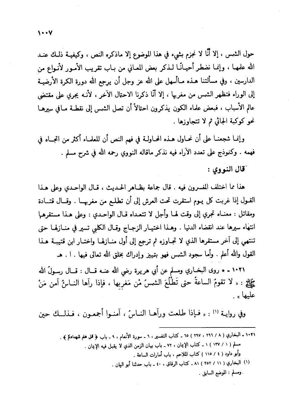 حول الشمس، إلا أنا لا نجزم بشيء في هذا الموضوع إلا ما ذكره النص، وكيفية ذلك عند الله علمها، وإنما نضطر أحياناً لذر بعض المعاني من باب تقريب الأمور لأنواع من الدارسين، وفي مسألتنا هذه ما أسهل على الله عز وجل أن يرجع الله دورة الكرة الأرضية إلى الوراء فتظهر الشمس من مغربها، إلا أنا ذكرنا الاحتمال الآخر، لأنه يجري على مقتضى عالم الأسباب، فبعض علماء الكون يذكرون احتمالاً أن تصل الشمس إلى نقطة ما في سيرها نحو كوكبة الجاثي ثم لا تتجاوزها.