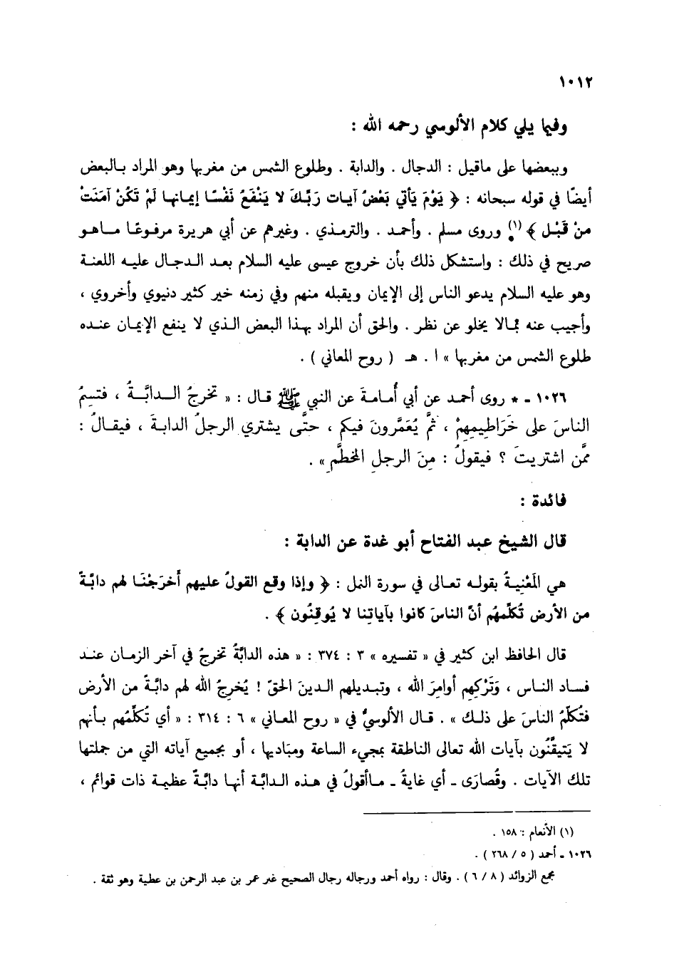1026 - * روى أحمد عن أبي أُمامة عن النبي صلى الله عليه وسلم قال: "تخرجُ الدابةُ، فتسمُ الناس على خراطيمهم، ثم يُعمرون فيكم، حتى يشتري الرجل الدابة، فيقال: ممن اشتريت؟ فيقول من الرجل المخطم".