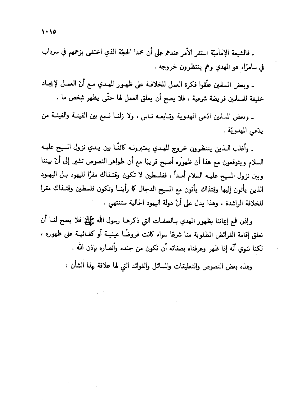 - وأغلب الذين ينتظرون خروج المهدي يعتبرونه كائناً بين يدي نزول المسيح عليه السلام ويتوقعون مع هذا أن ظهوره أصبح قريباً مع أن ظواهر النصوص تشير إ لى أن بيننا وبين نزول المسيح عليه السلام أمداً، ففلسطين لا تكون وقتذاك مقراً لليهود بل اليهود الذين يأتون إليها وقتذاك يأتون مع المسيح الدجال كما رأينا وتكون فلسطين وقتذاك مقراً للخلافة الراشدة، وهذا يدل على أن دولة اليهود الحالية ستنتهي.