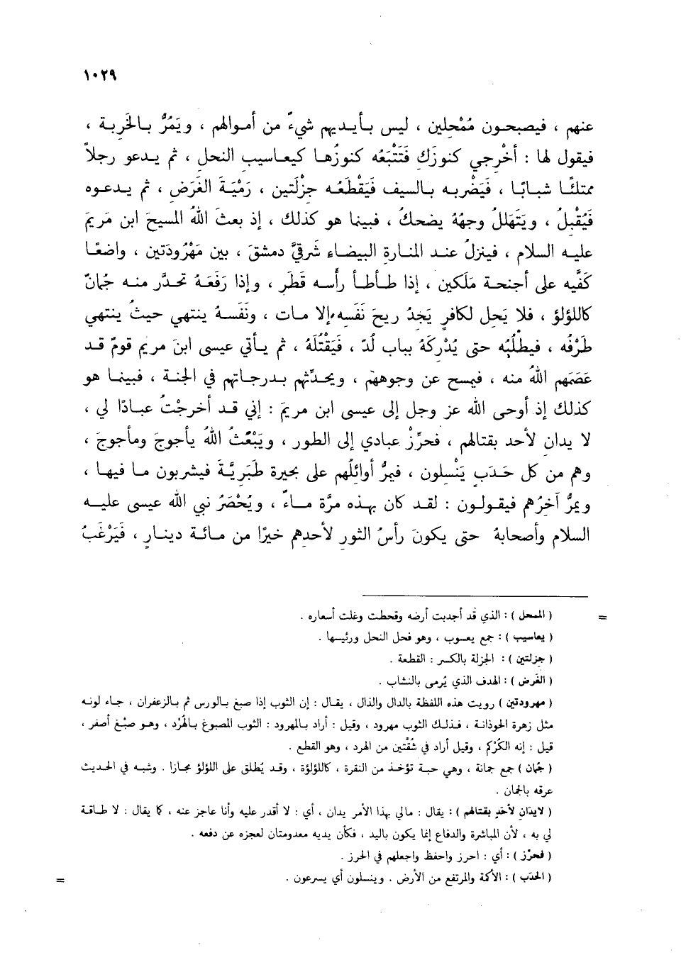 عنهم، فيصبحون ممحلين، ليس بأيديهم شيء من أموالهم، ويمر بالخربة، فيقول لها: أخرجي كنوزك فتتبعه كنوزها كيعاسيب النحل، ثم يدعو رجلاً ممتلئًا شبابًا، فيضربه بالسيف فيقطعه جزلتين، رمية الغرض، ثم يدعوه فيقبل، ويتهلل وجهه يضحك، فبينما هو كذلك، إذ بعث الله المسيح ابن مريم عليه السلام، فينزل عند المنارة البيضاء شرقي دمشق، بين مهرودتين، واضعًا كفيه على أجنحة ملكين، إذا طأطأ رأسه قطر، وإذا رفعه تحدر منه جمان كاللؤلؤ، فلا يحل لكافر يجد ريح نفسه إلا مات، ونفسه ينتهي حيث ينتهي طرفه، فيطلبه حتى يدركه بباب لد، فيقتله، ثم يأتي عيسى ابن مريم قوم قد عصمهم الله منه، فيمسح عن وجوههم، ويحدثهم بدرجاتهم في الجنة، فبينما هو كذلك إذ أوحى الله عز وجل إلى عيسى ابن مريم: إني قد أخرجت عبادًا لي، لا لأحد بقتالهم، فحرز عبادي إلى الطور، ويبعث الله يأجوج ومأجوج، وهم من كل حدبٍ ينسلون، فيمر أوائلهم على بحيرة طبرية فيشربون ما فيها، ويمر آخرهم فيقولون: لقد كان بهذه مرة مساء، ويحصر نبي الله عليه السلام وأصحابه حتى يكون رأس الثور لأحدهم خيرًا من مائة دينارٍ، فيرغب
