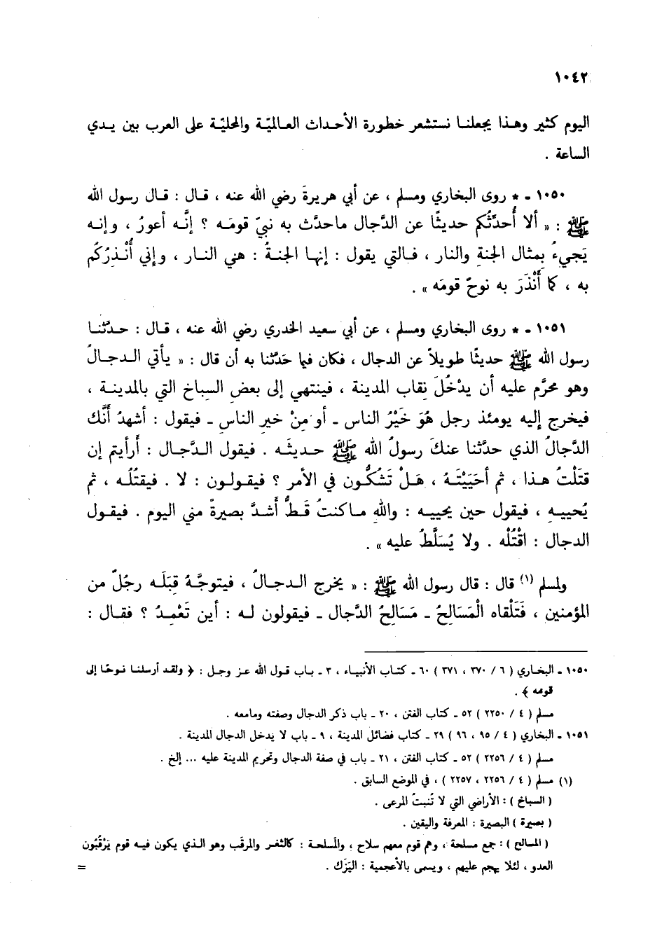1051 - * روى البخاري ومسلم، عن أبي سعيد الخدري رضي الله عنه، قال: حدثنا رسول الله صلى الله عليه وسلم حديثًا طويلاً عن الدجال، فكان فيما حدثنا به أن قال: "يأتي الدجال وهو محرم عليه أن يدخل نقاب المدينة، فينتهي إلى بعض السباخ التي بالمدينة، فيخرج إليه يومئذ رجل هو خير الناس -أو من خير الناس- فيقول: أشهد أنك الدجال الذي حدثنا عنك رسول الله صلى الله عليه وسلم حديثه. فيقول الدجال: أرأيتم إن قتلت هذا، ثم أحييته، هل تشكون في الأمر؟ فيقولون: لا. فيقتله، ثم يحييه، فيقول حين يحييه: والله ما كنت قط أشد بصيرة مني اليوم. فيقول الدجال: اقتله. ولا يسلط عليه".