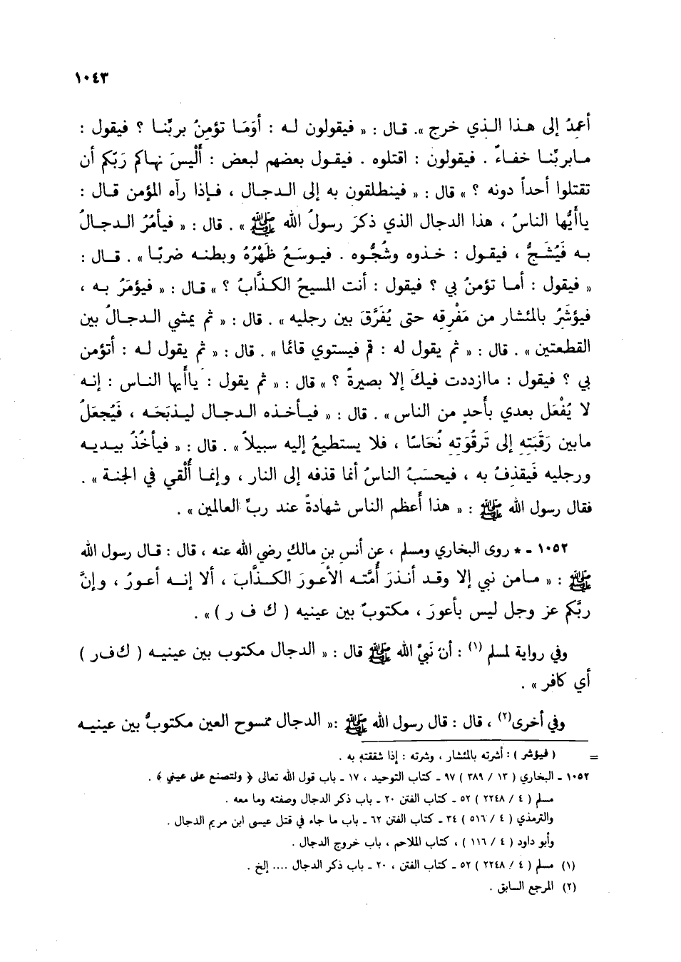 1052 - * روى البخاري ومسلم، عن أنس بن مالك رضي الله عنه، قال: قال رسول الله صلى الله عليه وسلم: "ما من نبي إلا وقد أنذر أمته الأعور الكذاب، ألا إنه أعور، وإن ربكم عز وجل ليس بأعور، مكتوب بين عينيه (ك ف ر) ".