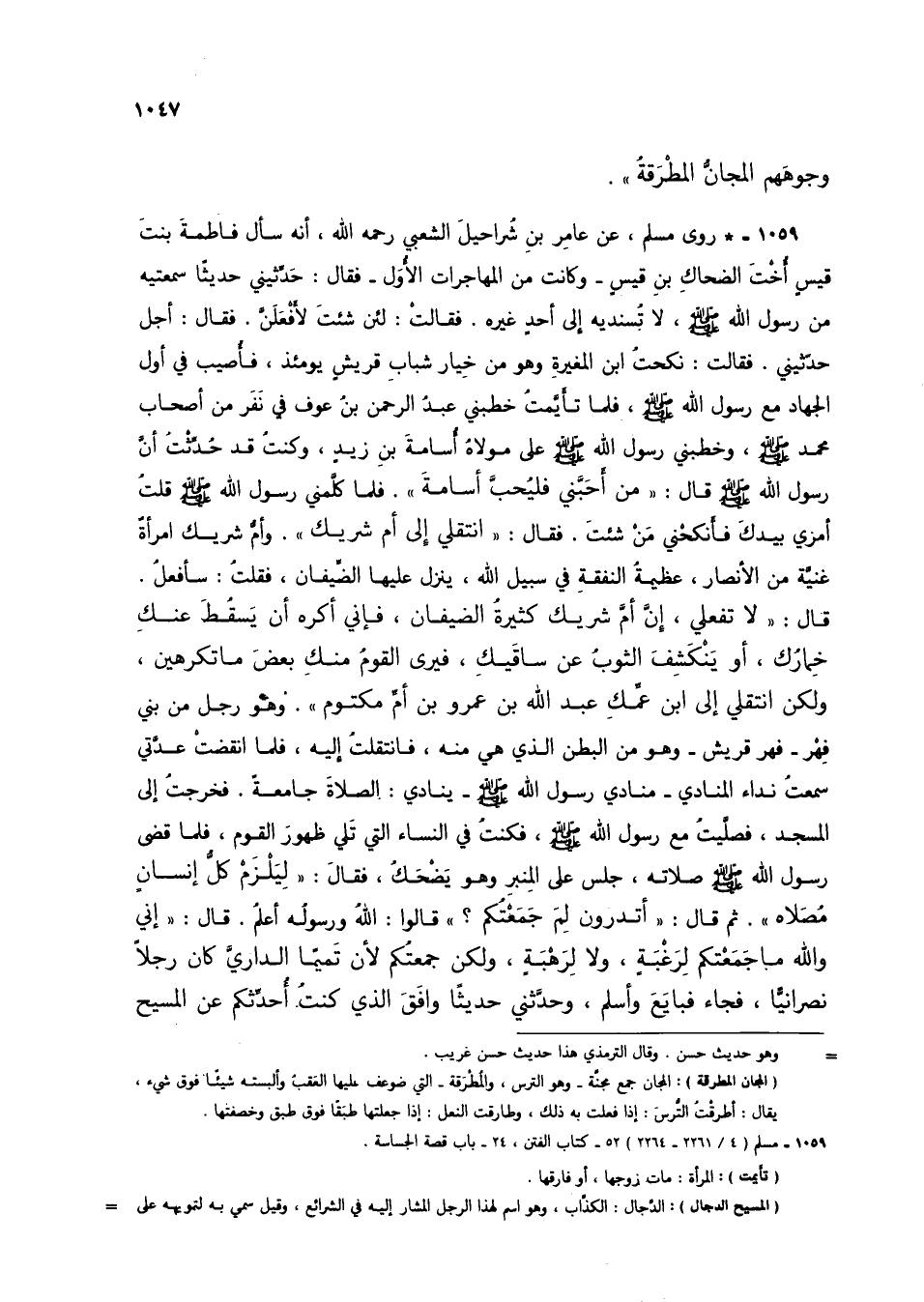 1059 - * روى مسلم، عن عامر بن شراحيل الشعبي رحمه الله، أنه سأل فاطمة بنت قيسٍ أخت الضحاك بن قيسٍ -وكانت من المهاجرات الأول- فقال: حدثيني حديثًا سمعتيه من رسول الله صلى الله عليه وسلم، لا تسنديه إلى أحدٍ غيره. فقالت: لئن شئت لأفعلن. فقال: أجل حدثيني. فقالت: نكحت ابن المغيرة وهو من خيار شباب قريشٍ يومئذ، فأصيب في أول الجهاد مع رسول الله صلى الله عليه وسلم، فلما تأيمت خطبني عبد الرحمن بن عوف في نفر من أصحاب محمد صلى الله عليه وسلم، وخطبني رسول الله صلى الله عليه وسلم على مولاة أسامة بن زيدٍ، وكنت قد حدثت أن رسول الله صلى الله عليه وسلم قال: "من أحبني فليحب أسامة". فلما كلمني رسول الله صلى الله عليه وسلم قلت أمري بيدك فأنكحني من شئت. فقال: "انتقلي إلى أم شريك". وأم شريك امرأة غنية من الأنصار، عظيمة النفقة في سبيل الله، ينزل عليها الضيفان، فقلت: سأفعل. قال: "لا تفعلي، إن أم شريك كثيرة الضيفان، فإني أكره أن يسقط عنك حمارك، أو ينكشف الثوب عن ساقيك، فيرى القوم منك بعض ما تكرهين، ولكن انتقلي إلى ابن عمك عبد الله بن عمرو بن أم مكتوم". وهو رجل من بني فهر -فهر قريش- وهو من البطن الذي هي منه، فانتقلت إليه، فلما انقضت عدتي سمعت نداء المنادي -منادي رسول الله صلى الله عليه وسلم- ينادي: الصلاة جامعة. فخرجت إلى المسجد، فصليت مع رسول الله صلى الله عليه وسلم، فكنت في النساء التي تلي ظهور القوم، فلما قضى رسول الله صلى الله عليه وسلم صلاته، جلس على المنبر وهو يضحك، فقال: "ليلزم كل إنسانٍ مصلاه". ثم قال: "أتدرون لم جمعتكم؟ " قالوا: الله ورسوله أعلم. قال: "إني والله ما جمعتكم لرغبةٍ، ولا لرهبةٍ، ولكن جمعتكم لأن تميما الداري كان رجلاً نصرانيًا، فجاء فبايع وأسلم، وحدثني حديثًا وافق الذي كنت أحدثكم عن المسيح