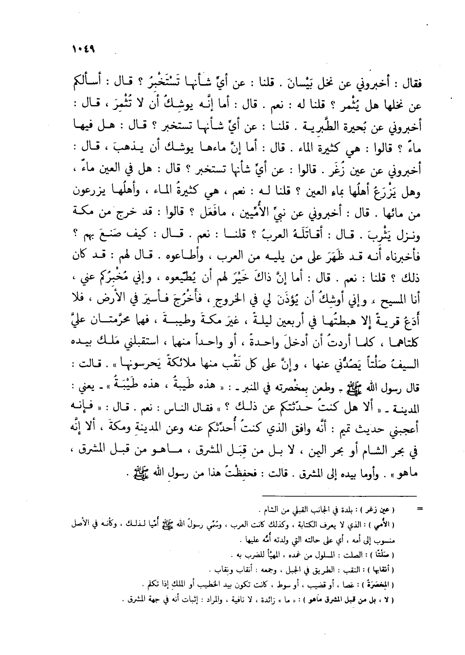 فقال: أخبروني عن نخل بيسان. قلنا: عن أي شأنها تستخبر؟ قال: أسألكم عن نخلها هل يثمر؟ قلنا له: نعم. قال: أما إنه يوشك أن لا تثمر، قال: أخبروني عن بحيرة الطبرية. قلنا: عن أي شأنها تستخبر؟ قال: هل فيها ماء؟ قالوا: هي كثيرة الماء. قال: أما إن ماءها يوشك أن يذهب، قال: أخبروني عن عين زغر. قالوا: عن أي شأنها تستخبر؟ قال: هل في العين ماء، وله يزرع أهلها بماء العين؟ قلنا له: نعم، هي كثيرة الماء، وأهلها يزرعون من مائها. قال: أخبروني عن نبي الأميين، ما فعل؟ قالوا: قد خرج من مكة ونزل يثرب. قال: أقاتله العرب؟ قلنا: نعم. قال: كيف صنع بهم؟ فأخبرناه أنه قد ظهر على من يليه من العرب، وأطاعوه. قال لهم: قد كان ذلك؟ قلنا: نعم. قال: أما إن ذاك خير لهم أن يطيعوه، وإني مخبركم عني، أنا المسيح، وإني أوشك أن يؤذن لي في الخروج، فأخرج فأسير في الأرض، فلا أدع قرية إلا هبطتها في أربعين ليلة، غير مكة وطيبة، فهما محرمتان علي كلتاهما، كلما أردت أن أدخل واحدة، أو واحدًأ منهما، استقبلني ملك بيده السيف صلتا يصدني عنها، وإن على كل نقب منها ملائكة يحرسونها". قالت: قال رسول الله صلى الله عليه وسلم -وطعن بمخصرته في المنبر-: "هذه طيبة، هذه طيبة" -يعني: المدينة- "ألا هل كنت حدثتكم عن ذلك؟ " فقال الناس: نعم. قال: "فإنه أعجبني حديث تميم: أنه وافق الذي كنت أحدثكم عنه وعن المدينة ومكة، ألا إنه في بحر الشام أو بحر اليمن، لا بل من قبل المشرق، ما هو من قبل المشرق، ما هو". وأومأ بيده إلى المشرق. قالت: فحفظت هذا من رسول الله صلى الله عليه وسلم. (1)