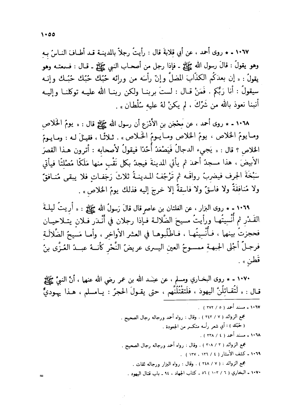 1067 - * روى أحمد، عن أبي قلابة قال: رأيت رجلاً بالمدينة قد أطاف الناس به وهو يقول: قال رسول الله صلى الله عليه وسلم -فإذا رجل من أصحاب النبي صلى الله عليه وسلم- قال: فسمعته وهو يقول: "إن بعدكم الكذاب المضل وإن رأسه من ورائه حبك حبك حبك وإنه سيقول: أنا ربكم، فمن قال: لست بربنا ولكن ربنا الله عليه توكلنا وإليه أنبنا نعوذ بالله من شرك، لم يكن له عليه سلطان".