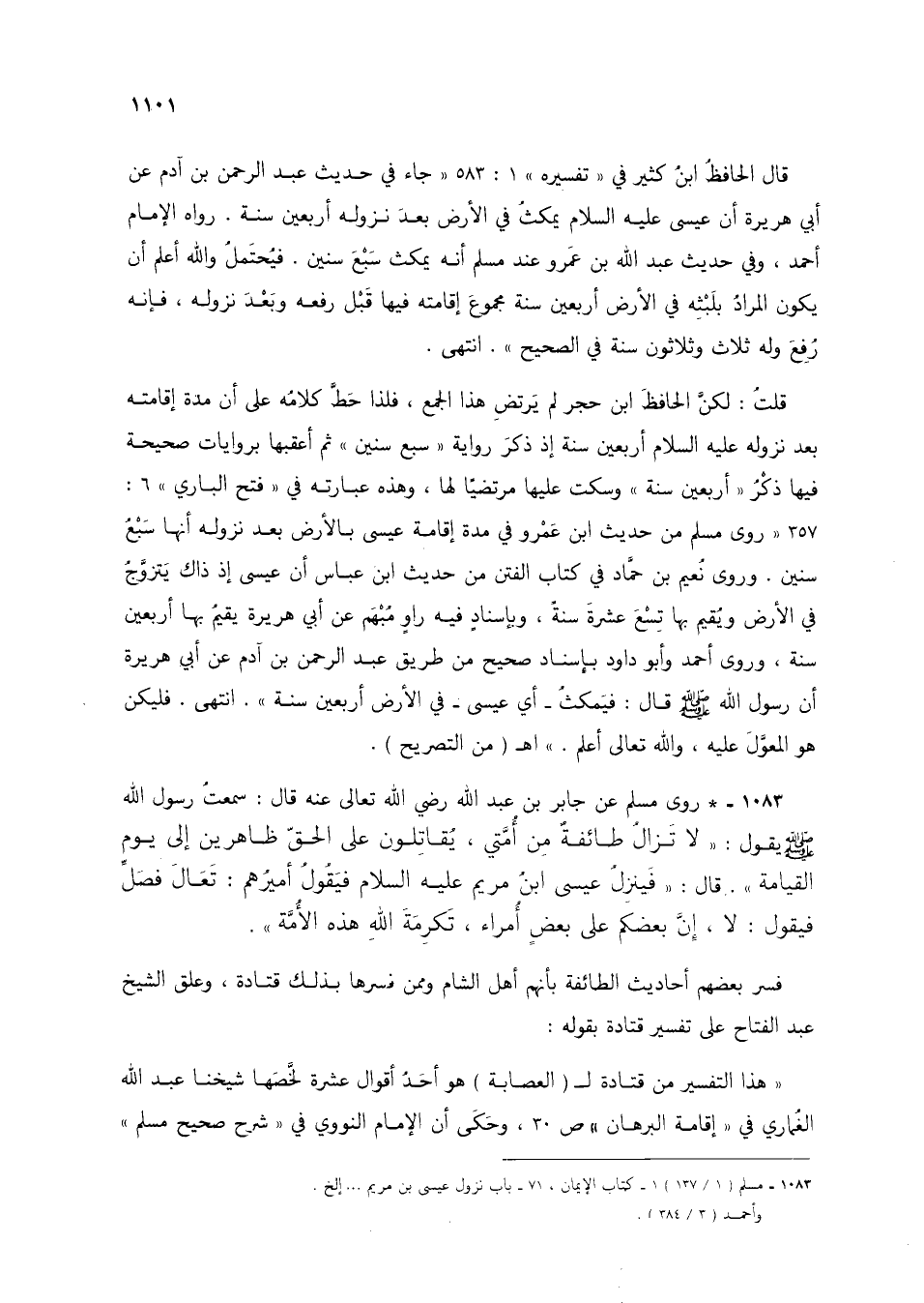 قلت: لكن الحافظ ابن حجر لم يرتض هذا الجمع، فلذا حط كلامه على أن مدة إقامته بعد نزوله. عليه السلام أربعين سنة إذ ذكر رواية "سبع سنين" ثم أعقبها بروايات صحيحة فيها ذكر "أربعين سنة" وسكت عليها مرتضيًا لها، وهذه عبارته في "فتح الباري" 6: 357 "روى مسلم من حديث ابن عمرو في مدة إقامة عيسى بالأرض بعد نزوله أنها سبع سنين. وروى نعيم بن حماد في كتاب الفتن من حديث ابن عباس أن عيسى إذ ذاك يتزوج في الأرض ويقيم بها تسع عشرة سنة، وبإسناد فيه راو مبهم عن أبي هريرة يقيم بها أربعين سنة، وروى أحمد وأبو داود بإسناد صحيح من طريق عبد الرحمن بن آدم عن أبي هريرة أن رسول الله صلى الله عليه وسلم قال: فيمكث -أي عيسى- في الأرض أربعين سنة". انتهى. فليكن هو المعول عليه، والله تعالى أعلم." اهـ (من التصريح).