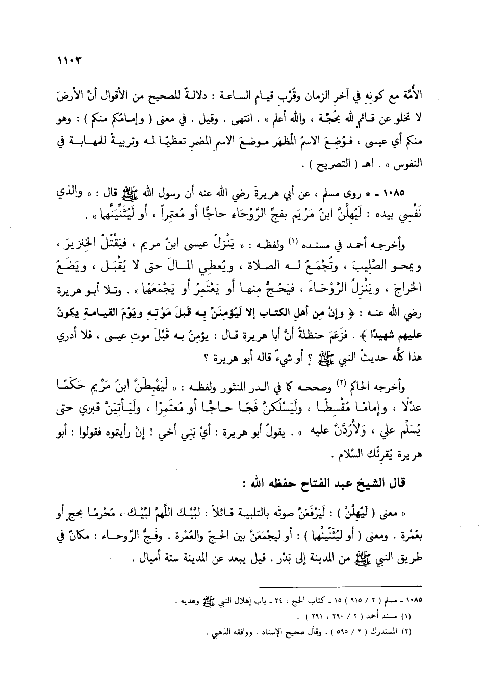 1085 - * روى مسلم، عن أبي هريرة رضي الله عنه أن رسول الله صلى الله عليه وسلم قال: "والذي نفسي بيده: ليهلن ابن مريم بفج الروحاء حاجًا أو معتمرًا، أو ليثنينهما".