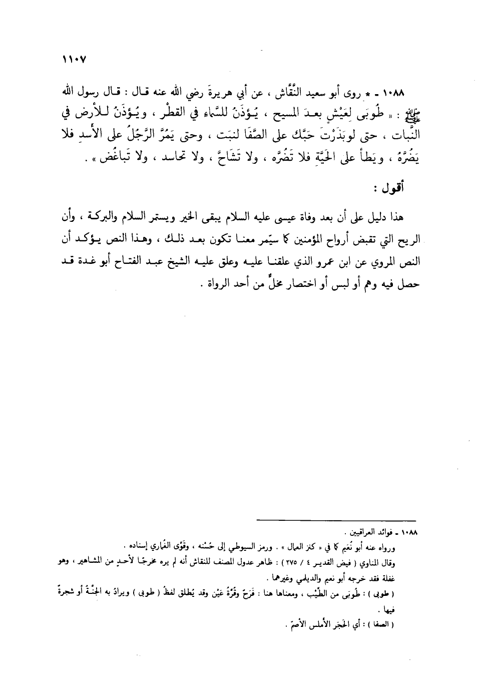 هذا دليل على أن بعد وفاة عيسى عليه السلام يبقى الخير ويستمر السلام والبركة، وأن الريح التي تقبض أرواح المؤمنين كما سيمر معنا تكون بعد ذلك، وهذا النص يؤكد أن النص المروي عن ابن عمرو الذي علقنا عليه وعلق عليه الشيخ عبد الفتاح أبو غدة قد حصل فيه وهم أو لبس أو اختصار مخل من أحد الرواة.
