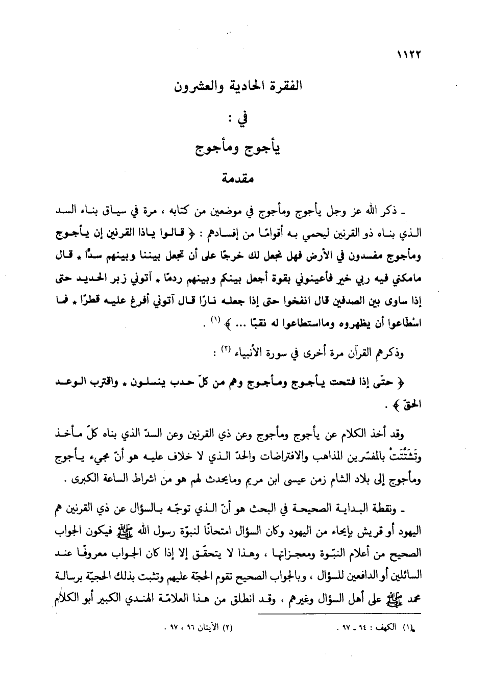 وقد أخذ الكلام عن يأجوج ومأجوج وعن ذي القرنين وعن السد الذي بناه كل مأخذ وتشتت بالمفسرين المذاهب والافتراضات والحد الذي لا خلاف عليه هو أن مجيء يأجوج ومأجوج إلى بلاد الشام زمن عيسى ابن مريم وما يحدث لهم هو من أشراط الساعة الكبرى.
