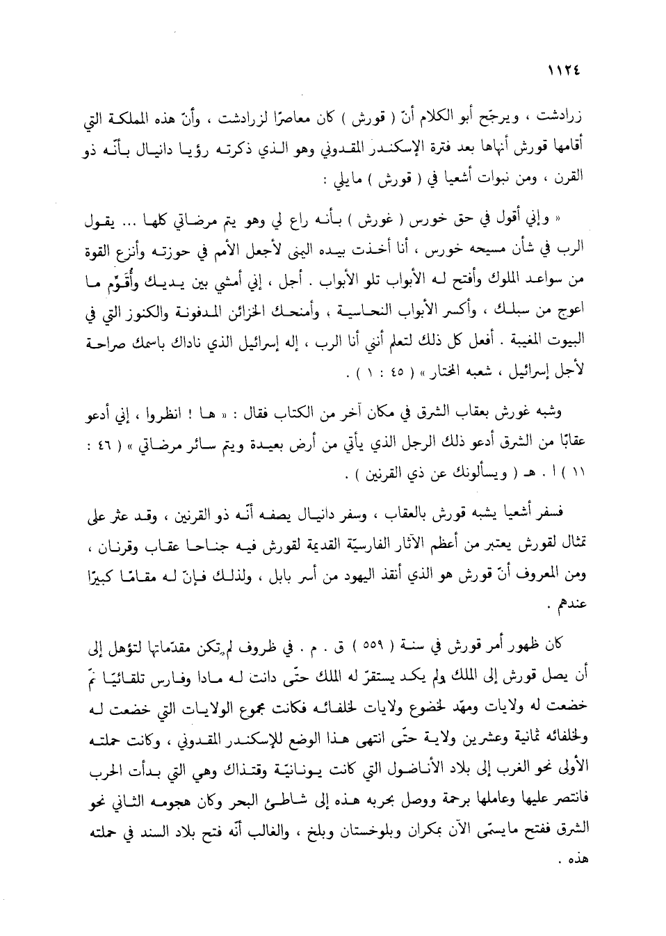 "وإني أقول في حق خورس (غورش) بأنه راع لي وهو يتم مرضاتي كلها .. يقول الرب في شأن مسيحه خورس، أنا أخذت بيده اليمنى لأجعل الأمم في حوزته وأنزع القوة من سواعد الملوك وأفتح له الأبواب تلو الأبواب. أجل، إني أمشي بين يديك وأقوم ما اعوج من سبلك، وأكسر الأبواب النحاسية، وأمنحك الخزائن المدفونة والكنوز التي في البيوت المغيبة. أفعل كل ذلك لتعلم أنني أنا الرب، إله إسرائيل الذي ناداك باسمك صراحة لأجل إسرائيل، شعبة المختار" (45: 1).