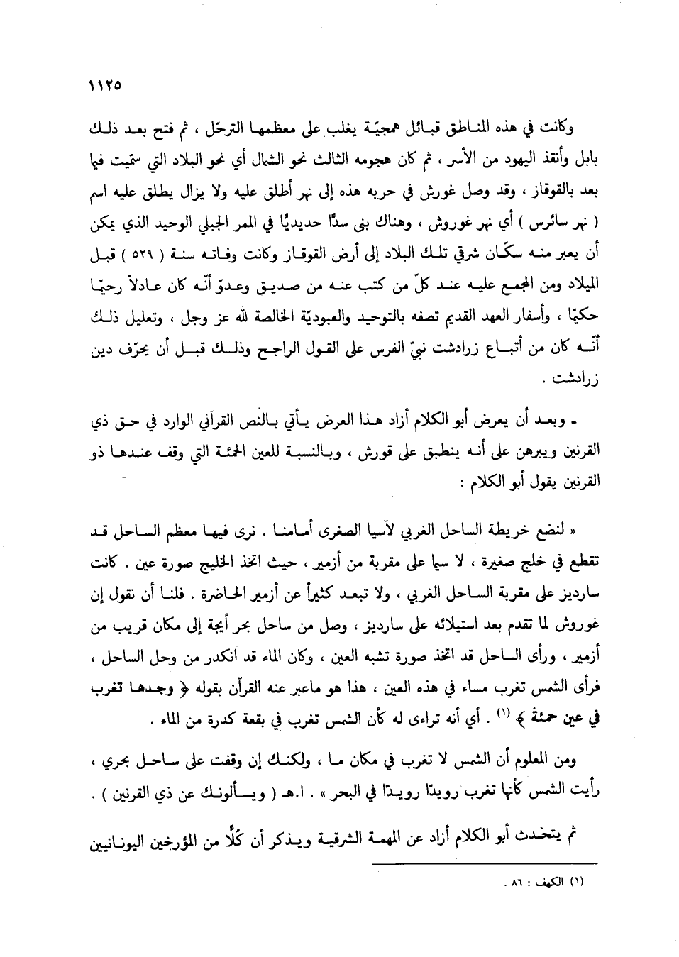 وبعد أن يعرض أبو الكلام أزاد هذا العرض يأتي بالنص القرآني الوارد في حق ذي القرنين ويبرهن على أنه ينطبق على قورش، وبالنسبة للعين الحمئة التي وقف عندها ذو القرنين يقول أبو الكلام: